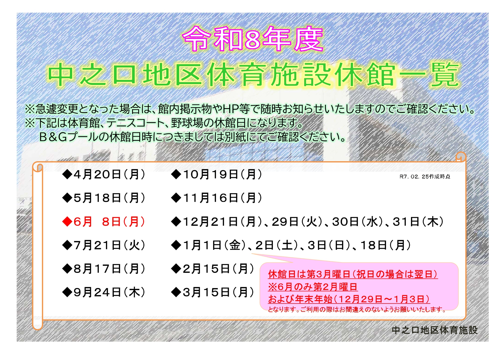 【施設共通】 ■各種ご案内を必ずご覧になり、ルールや、マナーを守ってご利用ください。守っていただけない場合、ご利用を中止していただくことがございます。 【屋外】 ■天候により施設者の判断で利用を中止していただく場合がございます。 【有事】 ■AED(自動体外式除細動器)設置場所:受付 【大会・イベント開催時】 ■施設管理者と協議の上、主催者の責任において、利用目的(種目)や利用方法を変更する場合があります。 |